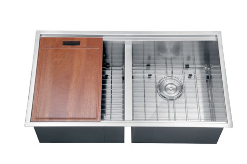 Ruvati RVH8350 Undermount Stainless Steel 33" Kitchen Sink Double Bowl?The combination of sharp, zero-radius corners with ledges on the front and back that act as a track for your matching cutting board make the Roma series a chef's dream. Each Roma sink come with bottom rinse grids, a cutting board and basket strainers.