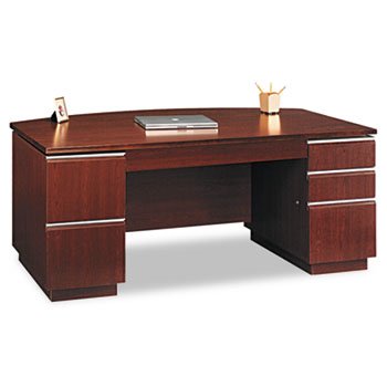 #Contemporary European styling in attractive pieces that are easy to reconfigure for customized workspace solutions. Durable Diamond Coat? finish on worksurface is scratch- and stain-resistant. PVC edge banding helps protect desk from bumps and scrapes. Install Ready?, pedestals are shipped pre-assembled. Desktop grommets and modesty panel openings for wire management. Kneewell locks are included for workstation privacy. Desk and Pedestals sold and shipped separately--ORDER BOTH. Color: Harvest Cherry; Pedestal Count: 2; Top Shape: Bow Front.