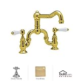 Rohl A1420XM Country Kitchen Bridge Faucet with Metal Cross Handles, Inca Brass. Country Kitchen Bridge Faucet with Metal Cross Handles Born in the Piedmonte region of France, an area known for its rich tradition of cuisine and culture, the Country Kitchen collection is defined by exquisite design. Straight lines are paired with gentle curves and ribbing details to create a classic look that is as popular today as it was years ago. And with function set as the cornerstone of all Rohl products, rest assured that the beauty of the Country Kitchen collection does not overshadow its use. Smooth handle operation, lifetime ceramic disc valves, and a sturdy feel that only all-brass construction could allow are all defining features of the Country Kitchen collection. As one of Rohl's largest collections, you will find that there are a variety of bold styles and finishes to choose from. Rohl A1420XM Features: All brass faucet body construction - weight: 8 lbs. Hand-machined from solid brass stock Industry leading, 1/4 turn lifetime ceramic disc valve Superior finishing process - chemical, scratch, and stain resistant Number of installation holes required: 2 Spout swivels to allow for unobstructed sink access Bridge-style, above the counter mixing valve Center-to-center distance between handle installation holes (faucet centers): 8" 2.2 gallons-per-minute flow rate Installs onto decks up to 1-17/64 thick Metal cross handles included Overall height: 9-11/64" (measured from counter top to highest point of faucet) Spout height: 6-3/8" (measured from counter top to faucet outlet) Spout reach: 9" (measured from center of faucet base to center of faucet outlet) Designed for use with standard U.S