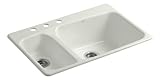 | ✚✚✚ Kohler K-5924-3-NY Lakefield Self-Rimming Kitchen Sink with Three-Hole Faucet Drilling, Dune K-5924-3-NY Faucet Holes: 3, Finish: Dune Finish shown Not available. Photo shows four-hole drilling. Fairfax faucet, Duostrainer sink strainers and dispenser not included. Features: -Basin depths: L 6'', R 9.5'' R. Options: -Available in the following finishes: white, almond, biscuit, black black. Construction: -Cast iron construction. Dimensions: -Overall dimensions: 33'' W x 22'' D. Warranty: -Manufacturer's warranty.