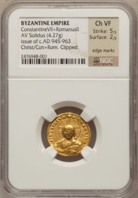 #Palmyraheritagegallerycom Constantine VII And Romanus II945959 AV Solidus 427 Gm Constantinople 946947 Nimbate BustOf Christ Facing Raising Hand In Benediction And Holding Gospels Crowned Facing Busts Of Constantine VII And Romanus II HoldingPatriarchal Cross Between Them DOC 15 SB 1751 Choice Very Fine NGC
