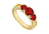 | ✚✚✚ Ruby Three Stone Ring : 14K Yellow Gold - 1.00 CT TGW Size 6.5 Three round radiant red rubies are prong-set in the center of the ring. The band is intricately designed in 14K yellow gold. This three stone ring has a total weight (TGW) of 1.00 ct.